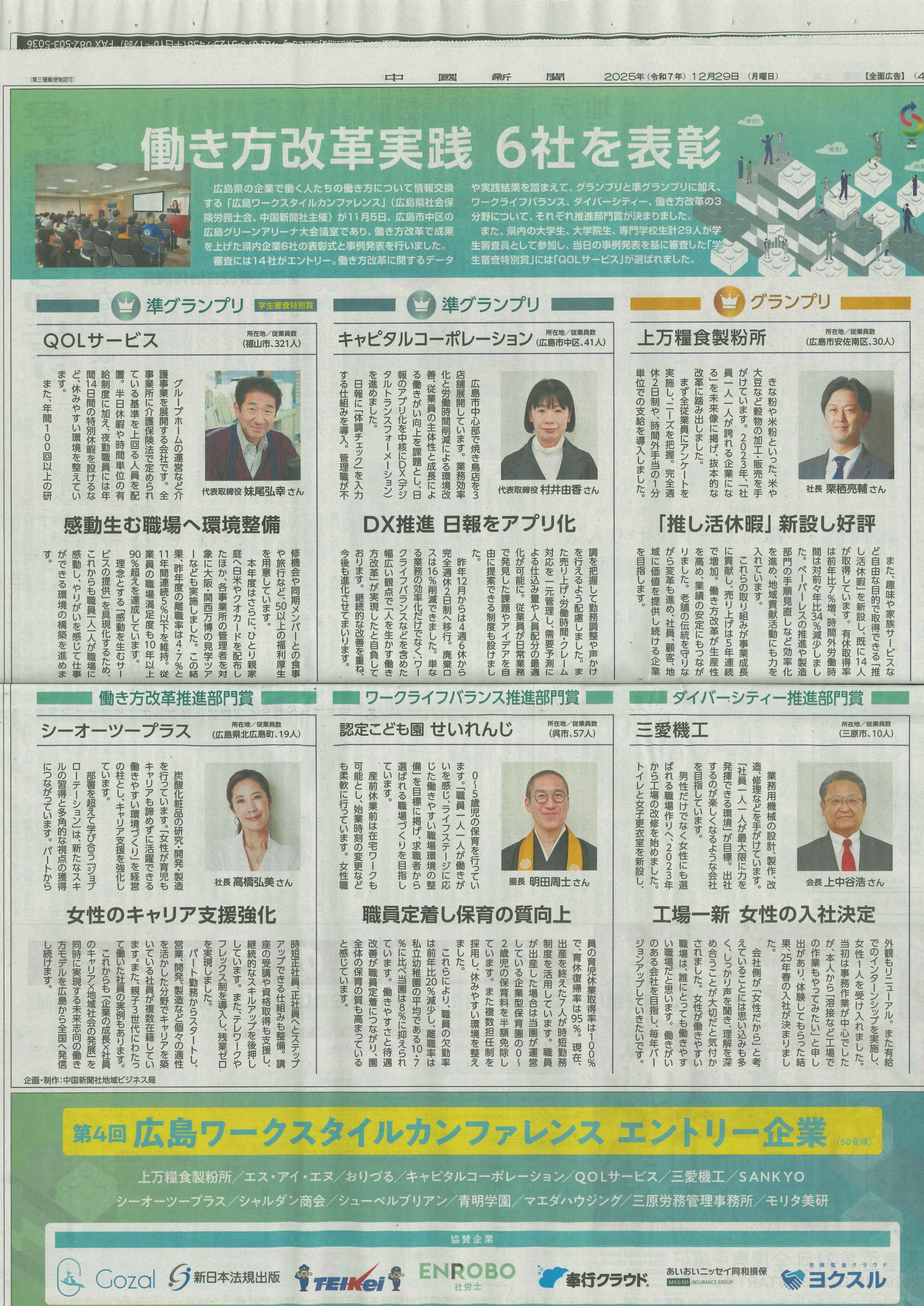 中国新聞『働き方改革実践 6社を表彰』で当社が紹介されました!